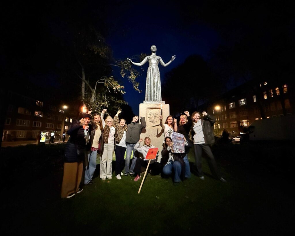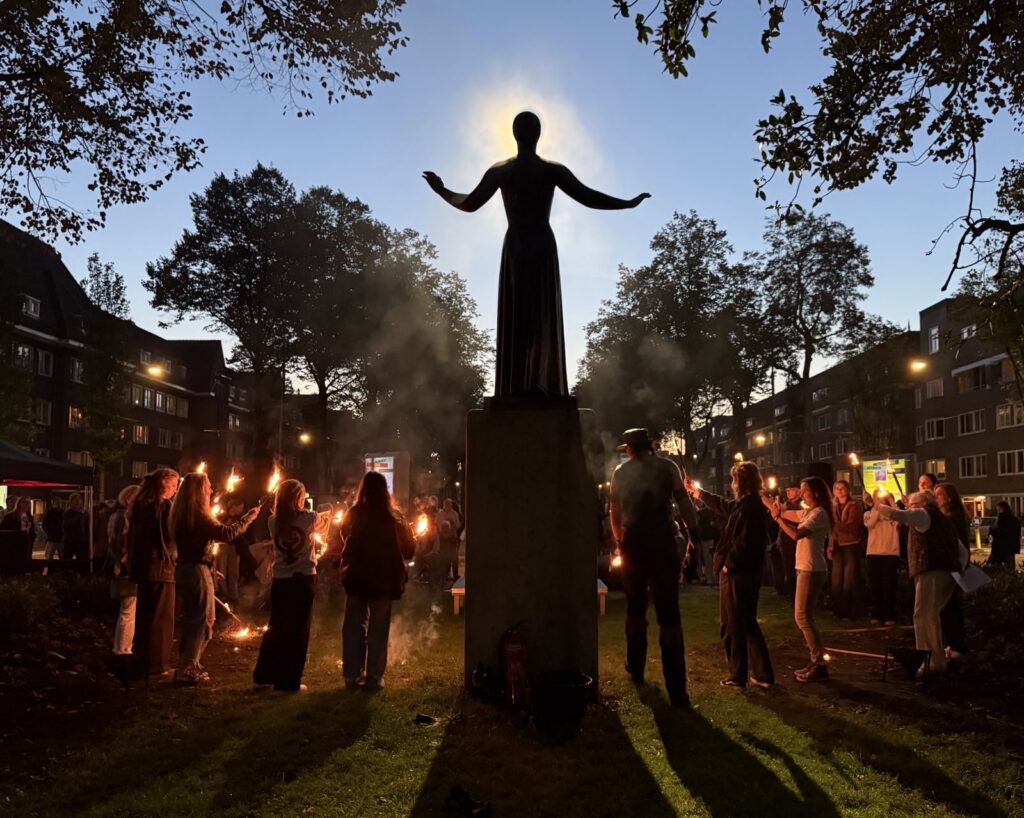 Het monument waarin we haar gedenken, werd in 1939 op haar verjaardag onthuld. Het werd vervaardigd door Gerrit Jan van der Veen, de beeldhouwer én latere verzetsheld. Aan de vooravond van die oorlog gaf dit beeld een boodschap van kracht en vrijheid. En vandaag – bijna een eeuw later – staan we opnieuw tegenover onzekerheid. Er heerst oorlogsdreiging; bevochten vrouwenrechten staan opnieuw onder druk; de veiligheid van vrouwen in openbare ruimtes is niet verbeterd; femicide schreeuwt om aandacht; kinderen krijgen op school nog steeds te horen dat de vrouw ondergeschikt is aan de man.